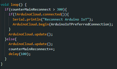 En void loop coloco mi lógica principal que solo dirá que cada tres segundos verifique si arduino cloud está conectado, si está conectado, solo actualizo mis datos de arduino cloud, y si no está conectado, hago la reconexión de arduino cloud.