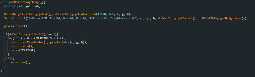 Finalmente la función más importante, esta función que define lo que se hace cuando hay un cambio de información de arduino cloud, fue declarada en el thingProperties, y a su vez dicho thingProperties se puede obtener del generado en la plataforma de Arduino Cloud, en este caso, defino una lógica, que cada vez que se ejecute esta función, es decir, que exista un cambio de variables en la nube de Arduino Cloud, haga una conversión de los datos de color de la nube que obtengo con getHue y getSaturation del objeto dHCastThing, luego simplemente limpio los pixeles de mi tira RGB WS2812B y vuelvo a asignar el mismo color a todos mis pixeles de la tira RGB, finalmente, muestro el resultado.