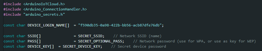 En el Arduino secrets, se pueden colocar los datos sensibles que tendrá el código, en este caso, será el secret device key y las credenciales de la red wifi a la que se conectará el dispositivo.